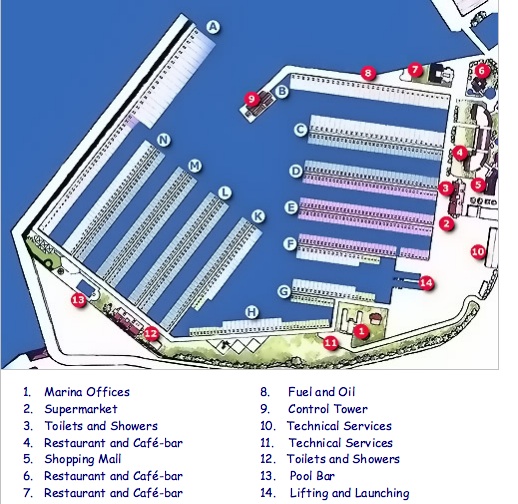 The Netsel Marina is located next to the old town of Marmaris at the south-western corner of Turkey. It is a one and a half hour drive to the Dalaman International Airport. The Island of Rhodes is only 25 miles away to the South. Two concrete-block breakwaters enclose a total area of nearly one hectar providing an easily accessible berth. Vessels up to 40m can moor here. The marina features a floating concrete docking system on which yachts are tied stern to. Each berth has access to a service box where you can get fresh water and electricity. The petrol station, situated on the inner breakwater, serves diesel, petrol and lubrication oil. Moreover, the marina maintains 24-hour security by guards. There is a 20t slip hoist and a 120 t travel lift for larger and heavier boats. Shopping malls, the international yacht club (IYC), restaurants, bars, cafes, travel agencies, a supermarket, an amphitheater, a swimming pool and medical aid can be found in the vicinity of the marina. The marina boat yard offers services such as mechanics, carpentry, sail repair, marine electronics, maintenance and repair.