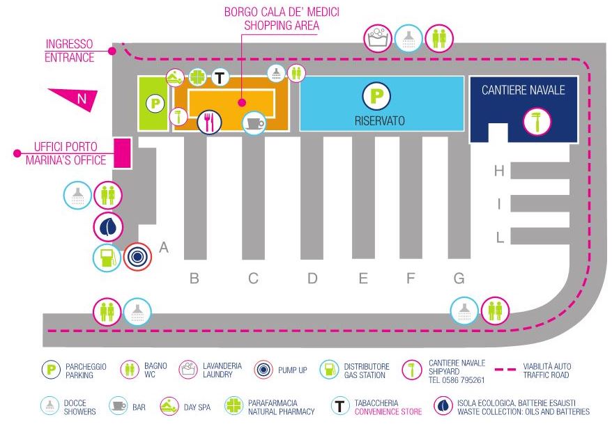 Cecina liegt zwischen den Hafenstädten Livorno und Piombino in der Toscana. Das Dock der Marina di Cecina liegt an der Mündung des Flusses Cecina am rechten Ufer und wird durch den Club Nautico Foce Cecina verwaltet. Die Marina verfügt über 4 Piers mit 150 Liegeplätzen mit einem Tiefgang bis max 1.5 m. Die max. Schiffslänge beträgt 40 m. Vorhanden sind Sanitäranlagen, Wasser- und Stromanschluss, Abwasserentsorgung, Kran, WiFi, Bar und Restaurant.